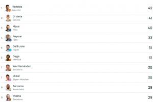 欧冠历史助攻榜前十(数据来自欧冠官网)