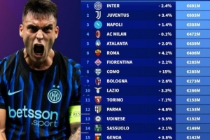 意甲俱乐部阵容身价排名:国米6.91亿欧元第一,科莫2.85亿欧第八