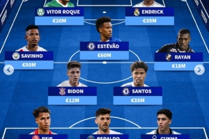 中场:布雷诺-比顿(科林蒂安,1200万欧)、安德烈-桑托斯(切尔西,3500万欧)、萨维尼奥(曼城,5000万欧)、埃斯特旺(切尔西,6000万欧)、拉扬(达伽马,1800万欧)
