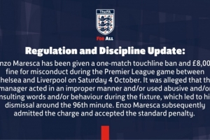 体育资讯10月15日讯 英格兰足球总会宣布,马雷斯卡因对阵利物浦比赛中存在不当行为染红,被处以禁赛一场及罚款8000英镑。